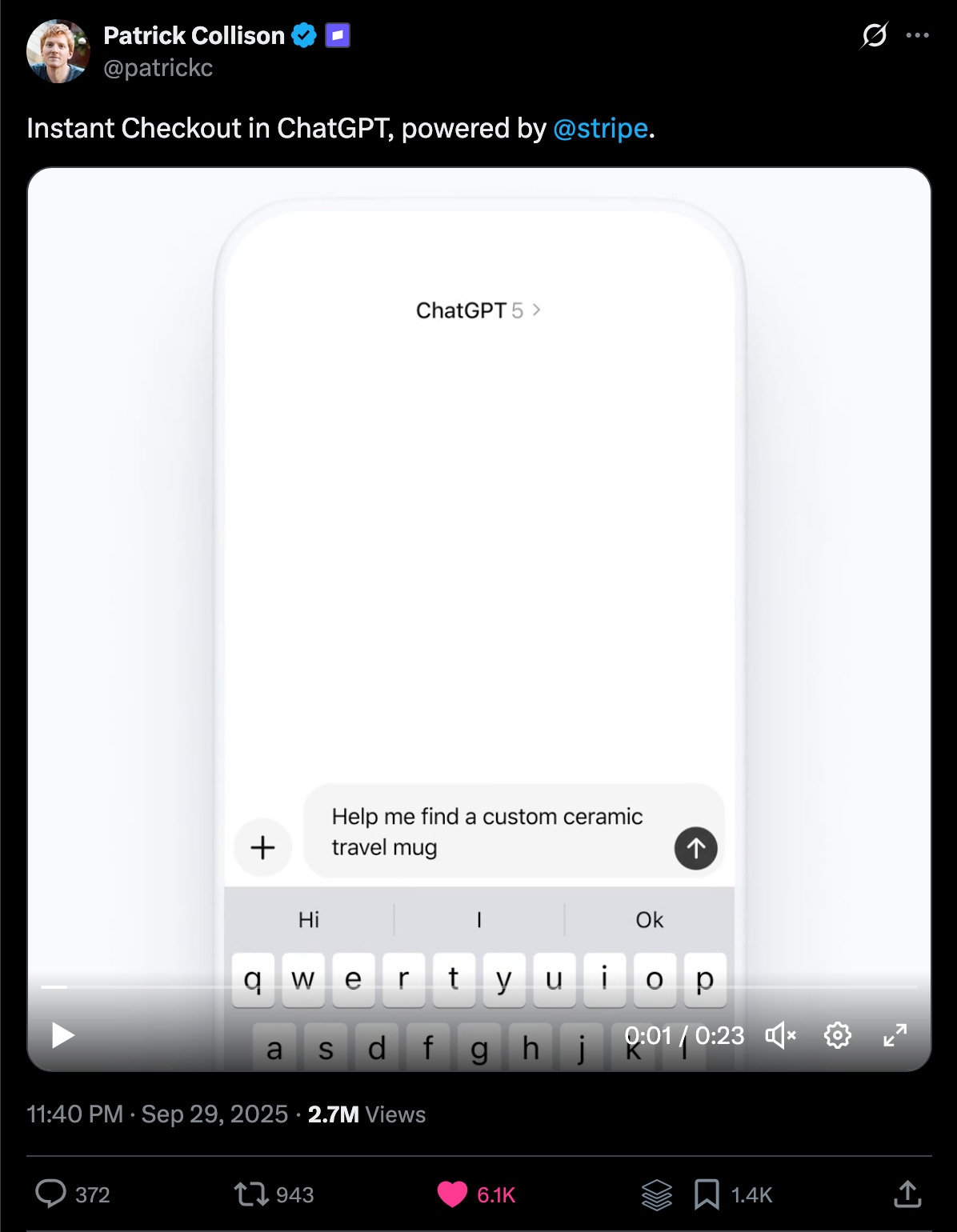 → Buy it in ChatGPT: Instant Checkout and the Agentic Commerce Protocol (openai.com) - OpenAI is taking first steps toward agentic commerce in ChatGPT with new ways for people, AI agents, and businesses to shop together.