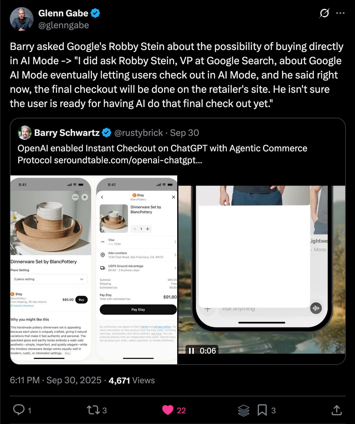 → Google is right now they are not going to roll out instant checkout in AI mode - (x.com)