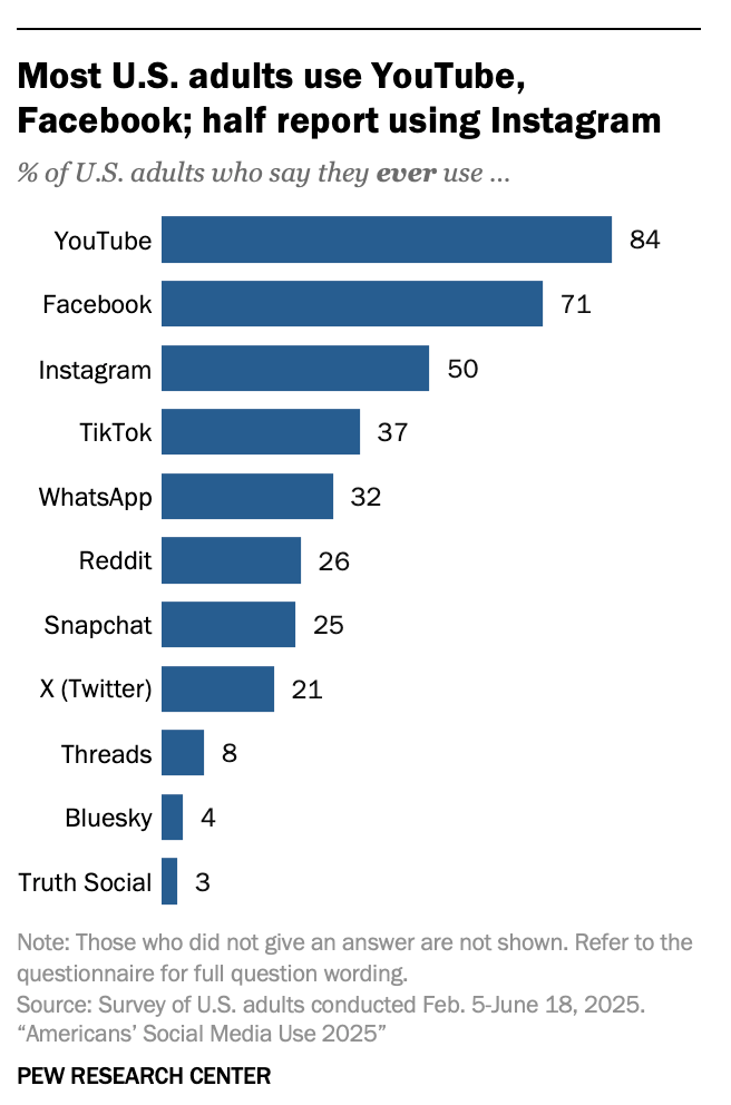 Recent survey data from over 5,000 U.S. adults shows YouTube (84%) and Facebook (71%) remain the most widely used platforms, with Instagram hitting the 50% mark. But the real story is generational: 80% of adults under 30 use Instagram, compared to just 19% of those 65 and older. TikTok, Instagram, WhatsApp, and Reddit have all grown since 2021, while YouTube and Facebook usage has stayed stable.